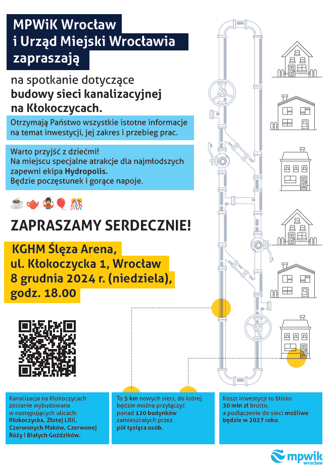 Inwestycja na Kłokoczycach to kolejny krok w kierunku poprawy infrastruktury w północno-wschodniej części miasta, łączący troskę o komfort mieszkańców i ochronę środowiska. Przypomnijmy, że Wrocław jest skanalizowany w 98 procentach. Dwa procent bez kanalizacji to obszary peryferyjne o małej gęstości zabudowy, oddalone od miejskiej sieci. Na obszarze miasta jest 3000 szamb, z czego 1000 z nich już dzisiaj można zlikwidować. Mieszkańcy tych nieruchomości mają dostęp do sieci kanalizacyjnej i w każdej chwili mogą się do niej podłączyć.
