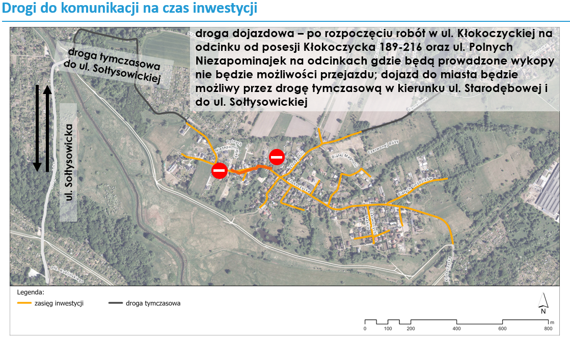 - druga droga tymczasowa do ul. Sołtysowickiej jest już przejezdna i będzie używana w razie potrzeby zorganizowania dojazdu w etapach, gdy ul. Kłokoczycka będzie nieprzejezdna; przypominamy, że ta droga będzie służyć jako objazd, gdy roboty przeniosą się na ul. Kłokoczycką za około miesiąc (będzie to jedyny dojazd do miasta dla: ogrodów działkowych ROD FREZJA i posesji na ul. Kłokoczyckiej)